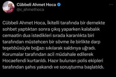 İstanbul İkitelli’de yaşanan olayda iddiaya göre karanlıktan çıkan kişi kamuoyunda Cübbeli Ahmet Hoca olarak tanınan Ahmet Mahmut Ünlü’nün boğazını sıkarak ağır küfürler etti.