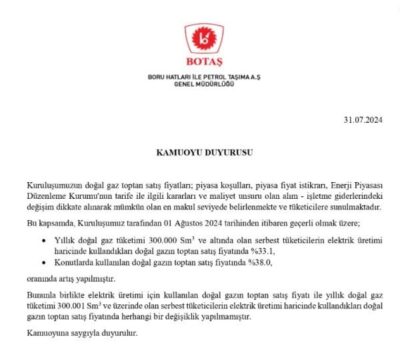 Boru Hatları ile Petrol Taşıma AŞ (BOTAŞ) tarafından, konutlarda kullanılan doğalgaza zam geldiği duyuruldu.