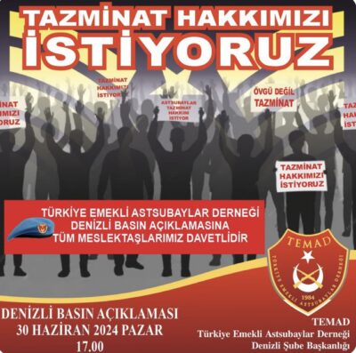 Türkiye Emekli Astsubaylar Derneği (TEMAD) Denizli Şube Başkanı Bülent Kandemir, sosyal medya hesabından yaptığı paylaşımda Astsubay emeklilerinin bir türlü yasalaşamayan haklarının verilmesi için 30 Haziran 2024 tarihinde bir yürüyüş düzenleneceğini duyurdu.