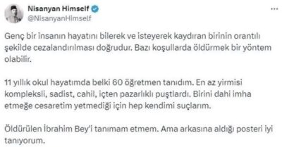 Nişanyan, sosyal medya hesabından yaptığı paylaşımda, cinayeti savundu ve şu ifadelere yer verdi: