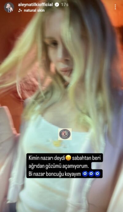 Sosyal medyasında paylaştığı fotoğrafına, kimin nazarı değdi ve sabahtan beri ağrıdan gözümü açamıyorum. Nazar boncuğu koyayım notunu düştü.