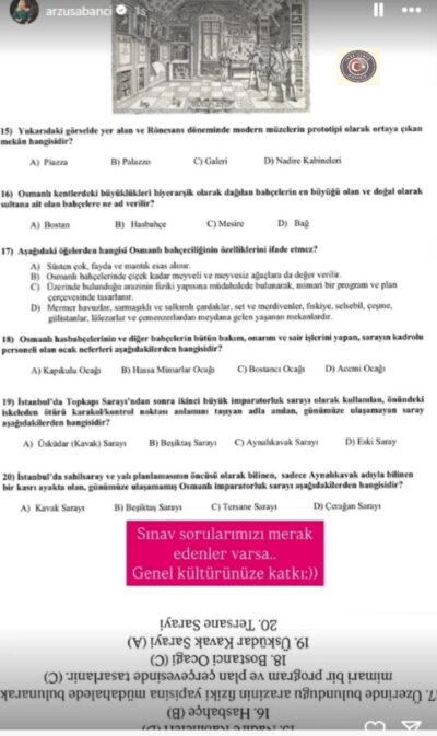 Özellikle Arzu Sabancı, sınav sorularını takipçileriyle paylaşarak programın içeriğine dair bilgi verdi.
