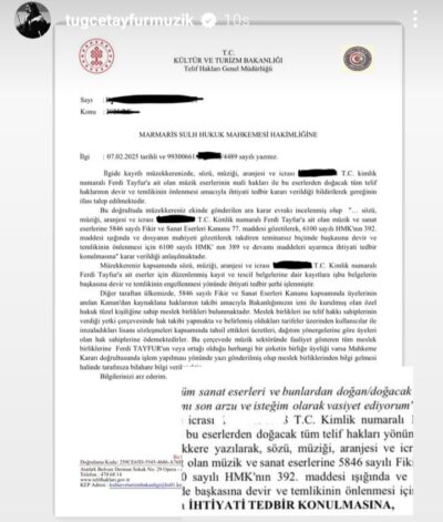 Ferdi Tayfur’un kızı Tuğçe Tayfur, babasının tüm fikri ve sınai haklarına tedbir konulduğunu açıkladı