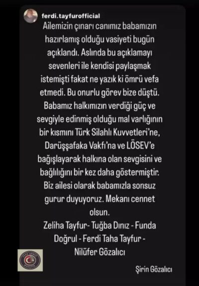 Vasiyetin imza kısmında, Tayfur’un eşi Zeliha Tayfur, çocukları Tuğba Dınız, Funda Doğrul, Ferdi Taha Tayfur ve Nilüfer Gözalıcı’nın adları yer aldı.