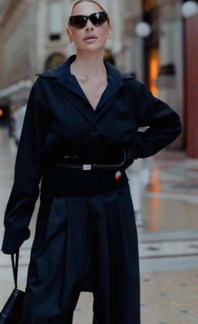 Hadise, siyah bol pantolon ve siyah gömlek kombinini siyah kemeri, siyah çantası ve siyah güneş gözlükleri ile izleyenleri mest etti.