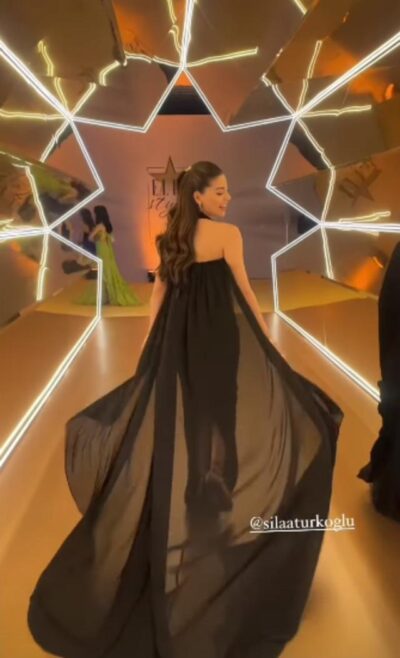 Uzun kuyruklu, göğüs dekolteli siyah bir elbise giyen Sıla Türkoğlu, muhteşem gözüküyordu.