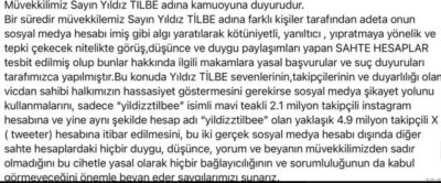 “‘Bir süredir müvekkilimiz Sayın Yıldız Tilbe, adına farklı kişiler tarafından adeta onun sosyal medya hesabıymış gibi algı yaratılarak kötü niyetli, yanıltıcı, yıpratmaya yönelik ve tepki çekecek nitelikte görüş, düşünce ve duygu paylaşımları yapan sahte hesaplar tespit edilmiş olup bunlar hakkında ilgili makamlara yasal başvurular ve suç duyuruları tarafımızca yapılmıştır. Bu konuda Yıldız Tilbe sevenlerinin, takipçilerinin ve duyarlılığı olan vicdan sahibi halkımızın hassasiyet göstermesini, gerekirse sosyal medya şikayet yolunu kullanmalarını, sadece mavi tikli 2.1 milyon takipçinin olduğu Instagram hesabına ve yine aynı şekilde yaklaşık 4.9 milyon takipçinin olduğu X (Twitter) hesabına itibar edilmesini, bu iki gerçek sosyal medya hesabı dışında diğer sahte hesaplardaki hiçbir duygu, düşünce, yorum ve beyanın müvekkilimizden sadır olmadığını, bu cihetle yasal olarak hiçbir bağlayıcılığının ve sorumluluğunun da kabul görmeyeceğini önemle beyan eder saygılarımızı sunarız.”