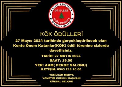Yeşilçam Medya Tarafından 21 Nisanda AKM’de düzenlenecek olan KENTE ÖNEM KATANLAR (KÖK) Ödül Töreni seçim dolayısıyla ertelendi. Yeşilçam Medya Yönetim Kurulu Başkanı Dr.Köksal Selçuk “ 21 Nisan’da gerçekleştirecek olduğumuz Kente Önem Katanlar(KÖK) Ödül Töreni’ni seçim dolayısıyla ertelemiş bulunmaktayız. Kente Önem Katanlar (KÖK) Ödül Töreni 27 Mayıs’ta AKM Perge Salonunda yapılacak” dedi.