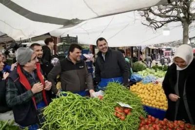 Kurum, pazarcı önlüğü giyip tezgaha geçti ve esnafın satışına yardım etti. Ulaşımdan şikayet eden bir vatandaşı dinleyen Kurum, “31 Mart’tan sonra bu sorunların hepsini halledeceğiz” dedi.