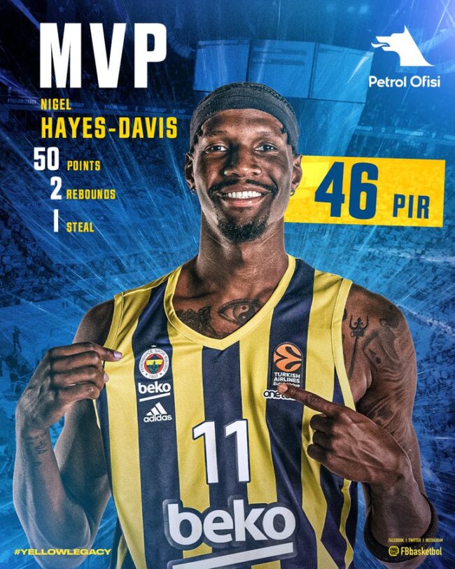 ALBA Berlin karşısında 50 sayı kaydeden Nigel Hayes-Davis, THY Avrupa Ligi’nde bir maçta en fazla sayı atan oyuncu ünvanını elde etti. Bir önceki rekor 49 sayıyla Anadolu Efes forması giyen Shane Larkin’e aitti. Fenerbahçe Beko bu sonuçla 32. haftada 20. galibiyetini elde etti. THY Avrupa Ligi’nin son sırasında yer alan ALBA Berlin ise 27. kez mağlup oldu. Sarı-lacivertli ekip ligin 33. haftasında 5 Nisan Cuma saat 20.45’te taraftarının önünde Anadolu Efes’i konuk edecek.