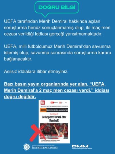 Skandal iddiayla ilgili Dezenformasyonla Mücadele Merkezi’nden de açıklama geldi. İddianın doğru olmadığı belirtilen açıklamada, “Bazı basın yayın organlarında yer alan, “UEFA, Merih Demiral’a 2 maç men cezası verdi.” iddiası doğru değildir. UEFA tarafından Merih Demiral hakkında açılan soruşturma henüz sonuçlanmamış olup, iki maç men cezası verildiği iddiası gerçeği yansıtmamaktadır. UEFA, milli futbolcumuz Merih Demiral’dan savunma istemiş olup, savunma sonrasında soruşturma karara bağlanacaktır. Asılsız iddialara itibar etmeyiniz” denildi.