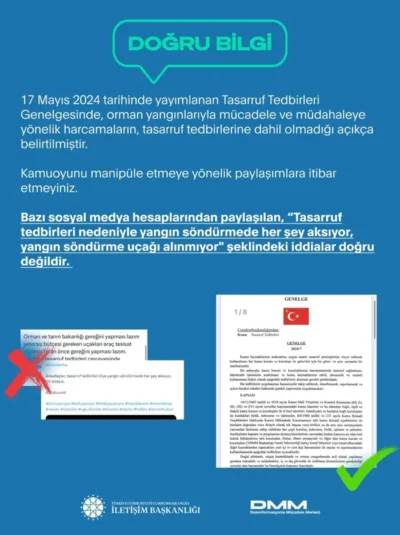 “17 Mayıs 2024 tarihinde yayımlanan Tasarruf Tedbirleri Genelgesinde, orman yangınlarıyla mücadele ve müdahaleye yönelik harcamaların, tasarruf tedbirlerine dahil olmadığı açıkça belirtilmiştir. Kamuoyunu manipüle etmeye yönelik paylaşımlara itibar etmeyiniz.”