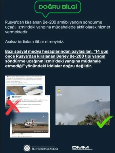 Cumhurbaşkanlığı İletişim Başkanlığı Dezenformasyonla Mücadele Merkezi (DMM), “14 gün önce Rusya’dan kiralanan Beriev Be-200 tipi yangın söndürme uçağının İzmir’deki yangına müdahale etmediği” iddialarının doğru olmadığını bildirdi.
