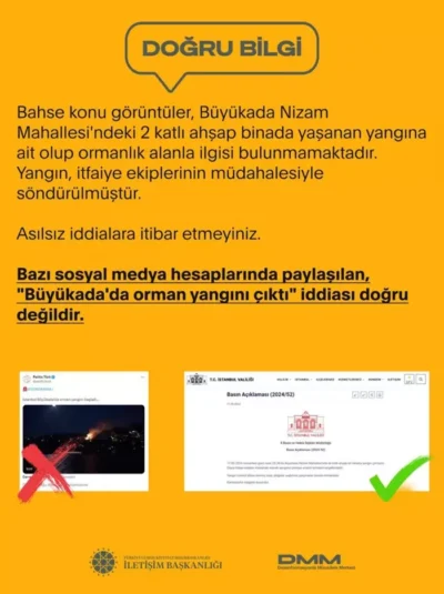 “Bahse konu görüntüler, Büyükada Nizam Mahallesi’ndeki 2 katlı ahşap binada yaşanan yangına ait olup ormanlık alanla ilgisi bulunmamaktadır. Yangın, itfaiye ekiplerinin müdahalesiyle söndürülmüştür. Asılsız iddialara itibar etmeyiniz.”